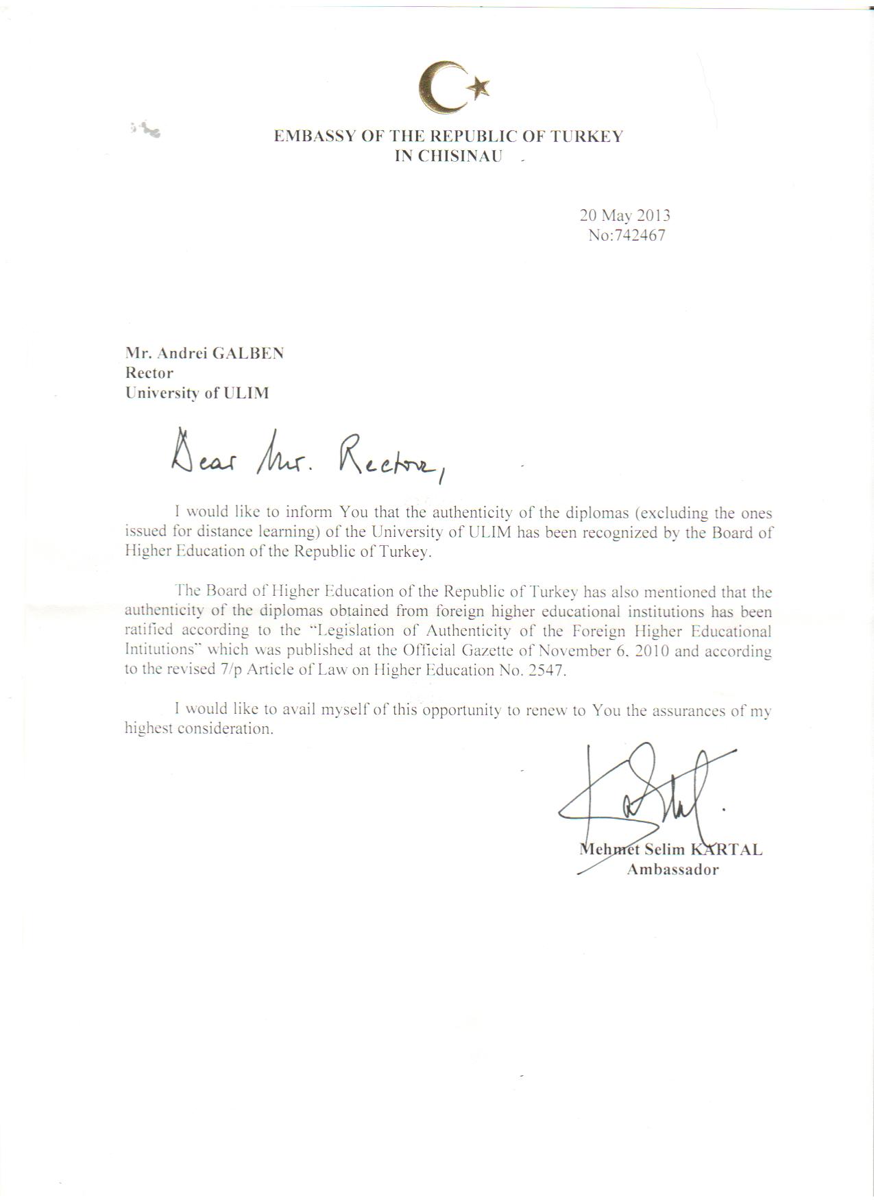 Așadar, de astăzi înainte orice tânăr turc care va studia la ULIM va putea obține aici o diplomă valabilă în țara sa, după cum și orice tânăr din R. Moldova, care va absolvi ULIM, va avea posibilitate să muncească în Turcia pe specialitatea înscrisă în diploma sa. Recunoașterea diplomelor ULIM de către Turcia se datorează eforturilor perseverente ale acestei universități de a se alinia la standardele internaționale din domeniul învățământului superior. Acest succes remarcabil este rezultatul managementului de performanță dezvoltat de ULIM, în frunte cu academicianul Andrei Galben. Și, întrucât între Republica Moldova şi Republica Turcia nu există deocamdată un Protocol de Colaborare în domeniul Educaţiei, rezultă că meritul este exclusiv al acestei universități.