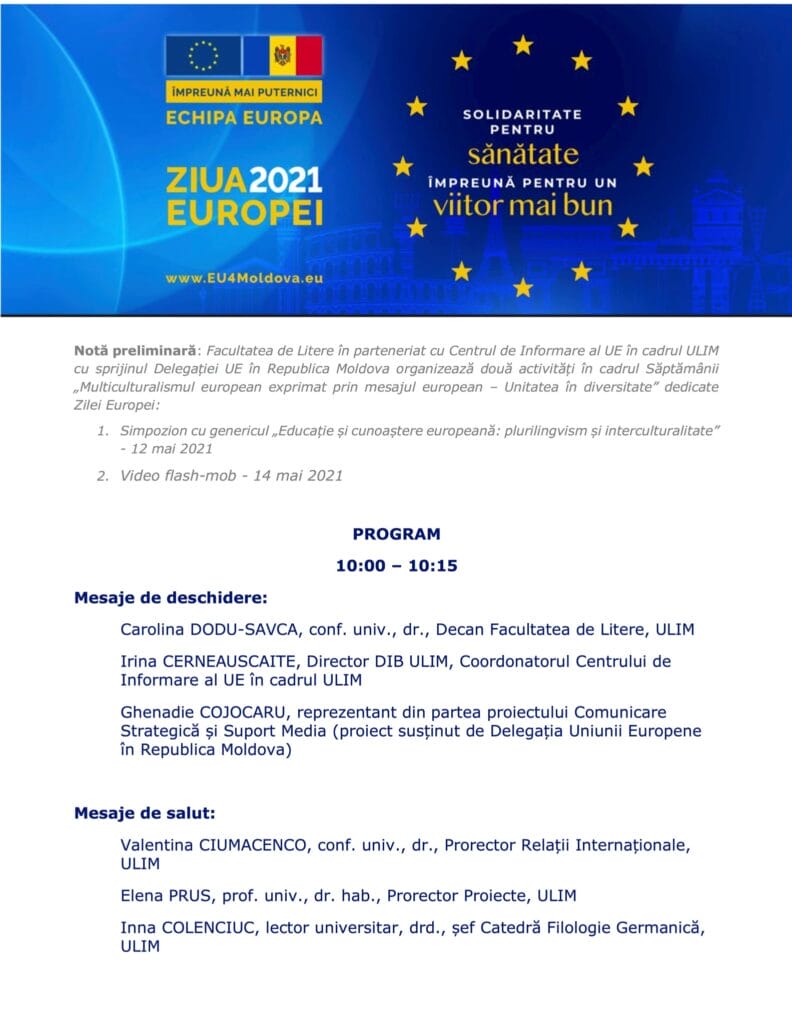 #Facultatea de Litere #ULIM Universitatea Liberă Internaţională din Moldova, în parteneriat cu #DIB Departamentul Informațional Biblioteconomic și #CIUE Centrul de informare al Uniunii Europene #UE în cadrul ULIM, organizează Simpozionul dedicat Zilei Europei „Educație și cunoaștere europeană: plurilingvism și interculturalitate”12 mai 2021, ora 10.00